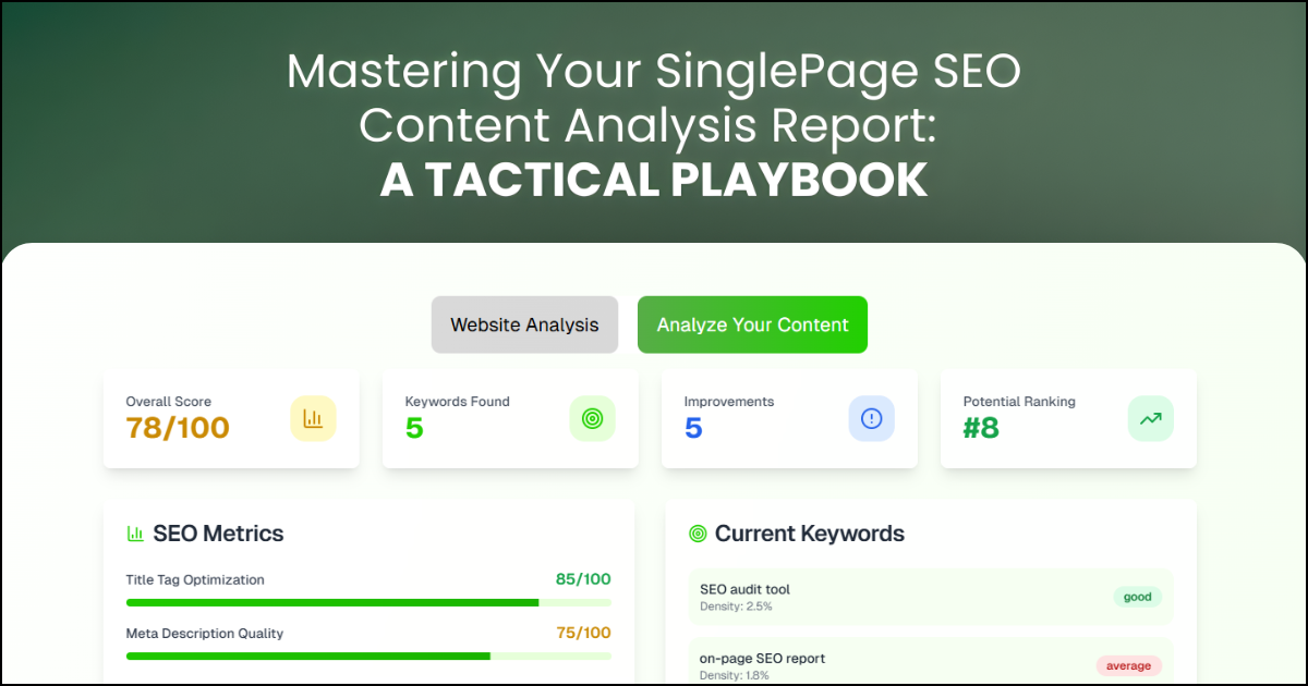 The SinglePage SEO Content Analysis Report is your clear, actionable roadmap to transforming your page content. It focuses on driving higher search visibility and user engagement by removing the guesswork from content optimization. Whether you're optimizing your first piece of copy or managing a large content portfolio, this guide provides the detailed walk-through you need, transforming raw analysis into a prioritized, tactical plan for maximum search performance.
